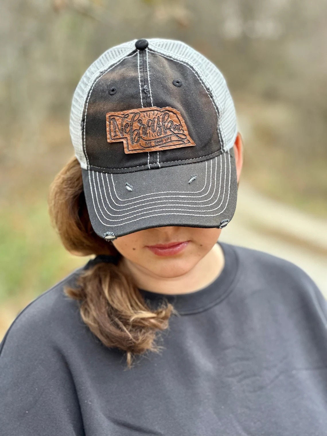 Nebraska Leather Hand Lettered Patch Ladies Hat